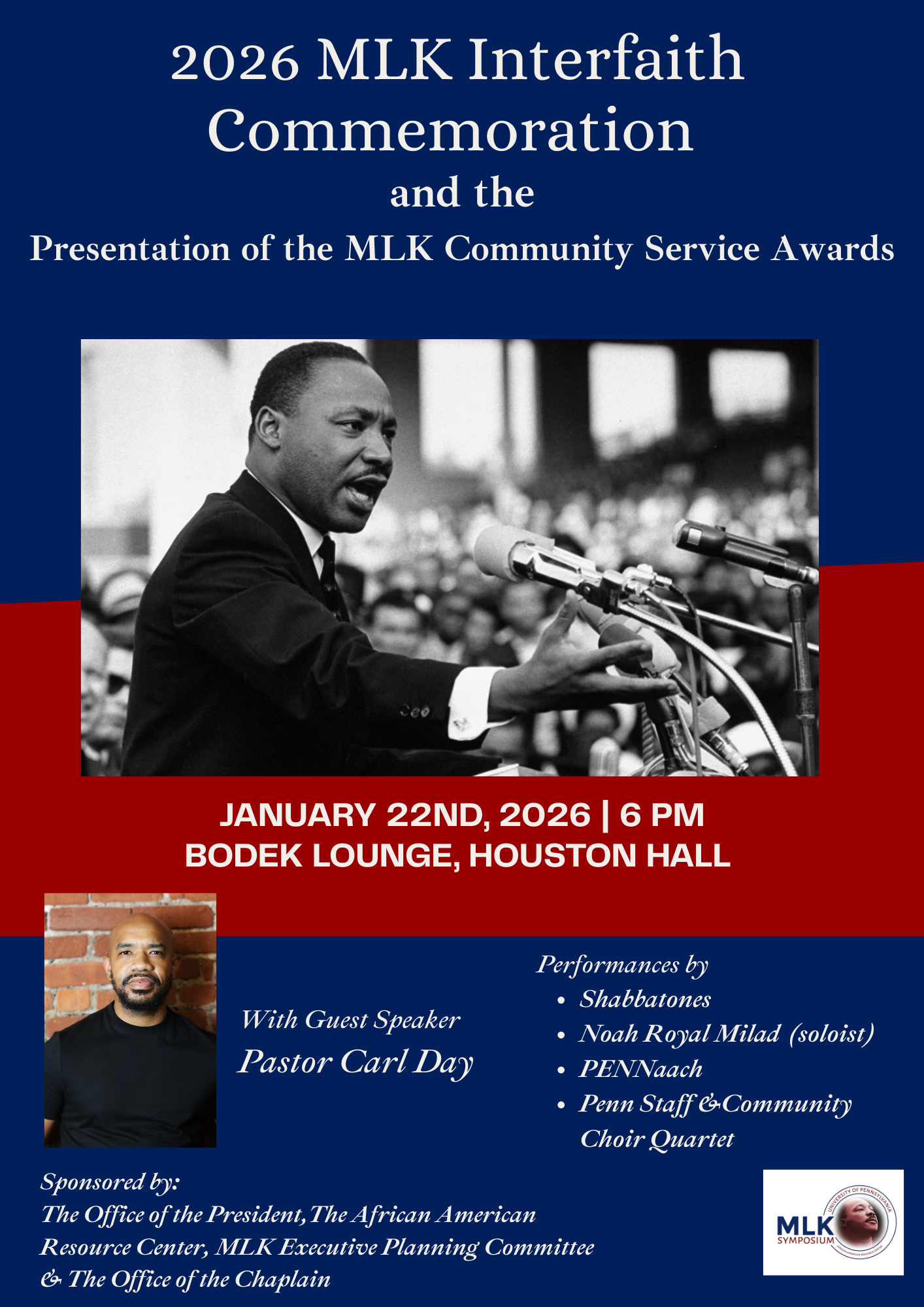 Join us for Penn’s Annual MLK Interfaith Commemoration event on January 22, 6 PM in Houston Hall.